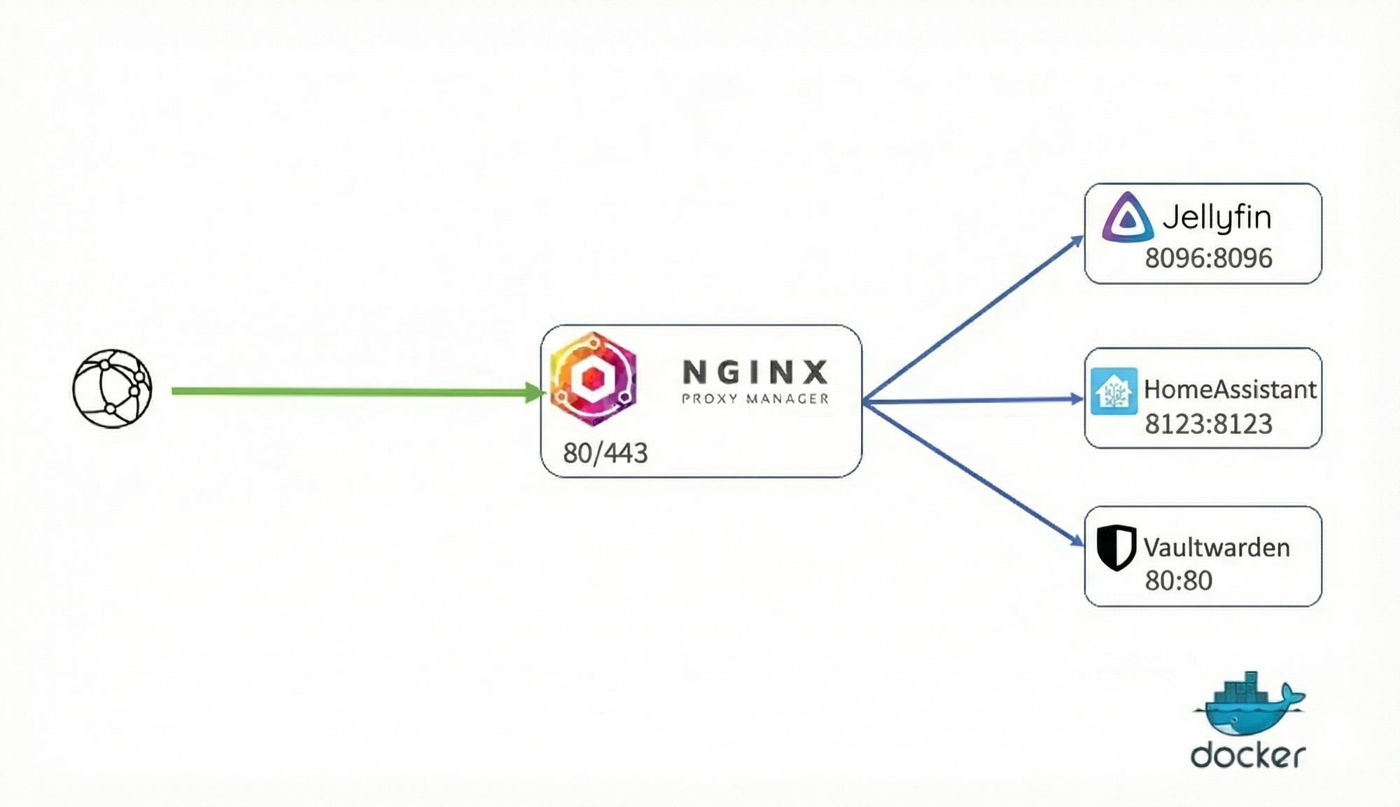 Instead of opening dozens of ports on my router—which is a massive security risk—I forward just ports 80 and 443 to NPM. This container acts as a "reverse proxy," sitting between the internet and my internal services. When I type jelly.mydomain.com, NPM receives the request, checks the domain, and silently routes it to the correct internal IP and port for my Jellyfin server.
