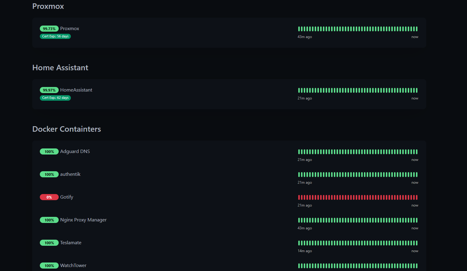 This beautiful, self-hosted monitoring tool constantly pings my entire infrastructure—my Jellyfin LXC, my TrueNAS storage shares, my reverse proxy, and even external websites. It logs response times and uptime percentages with a sleek dashboard that looks professional but uses minimal resources.